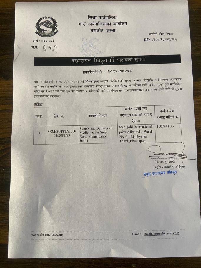 Sinja Rural Municipalality Office of the Rural Municipal Executive Narakot, Jumla Invitation for Bid