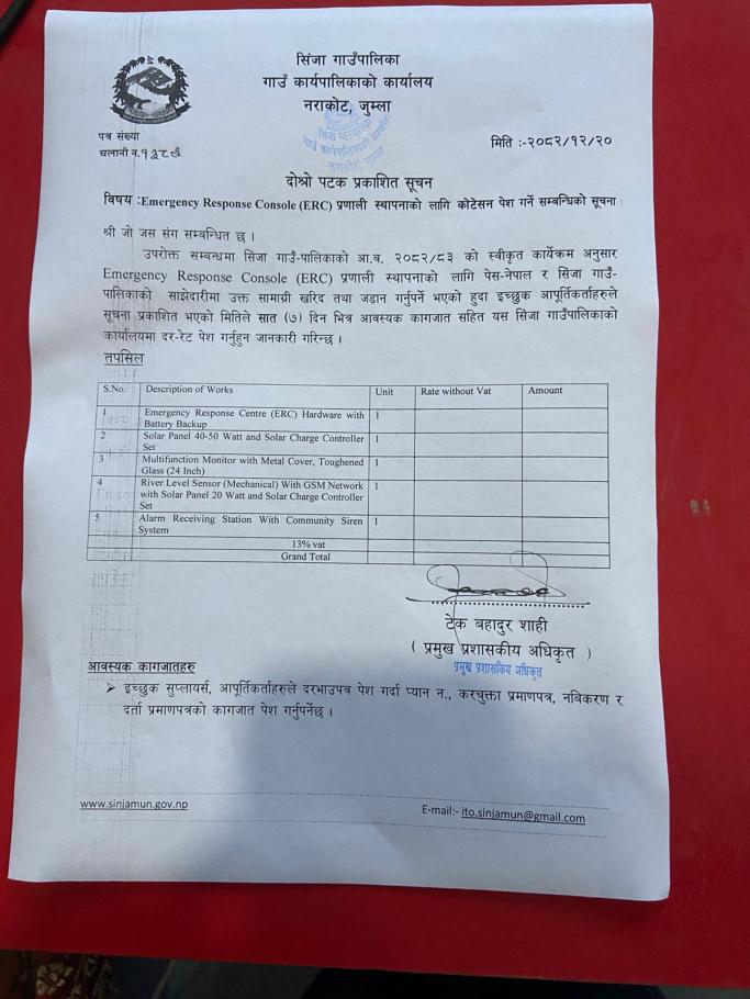 » दोस्रो पटक प्रकाशित सूचना Emergency Response Console (ERC) प्रणाली स्थापनाको लागि कोटेशन पेश गर्ने सम्बन्धि सूचना
