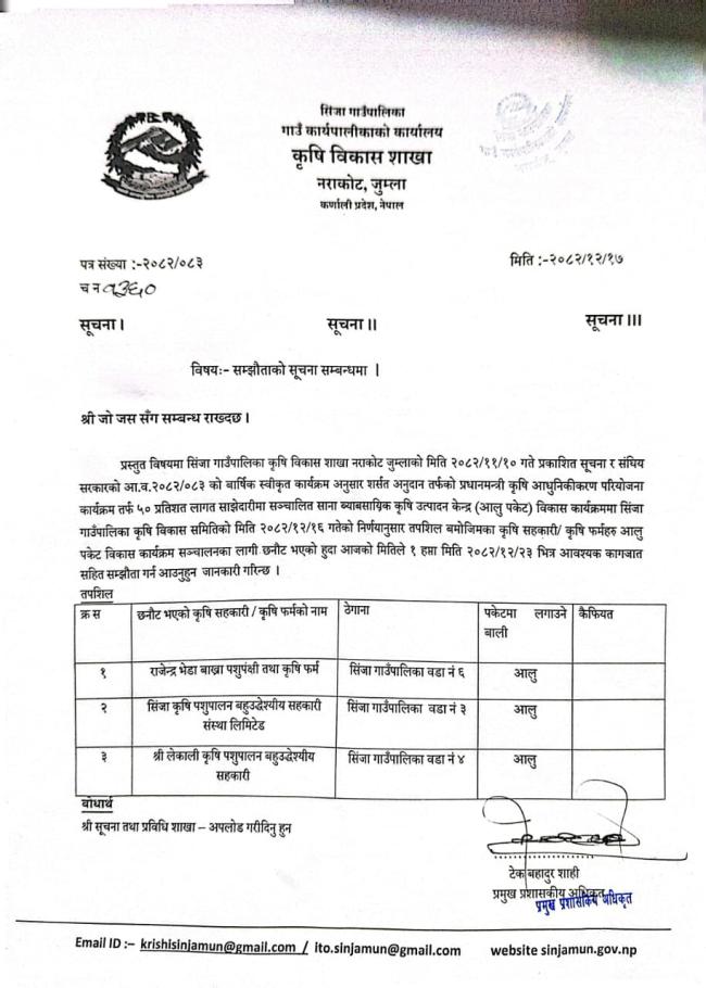 कार्यक्रम सञ्चालनका लागि कृषि समूह र उद्यमी छनौट गरिएको बारे ।